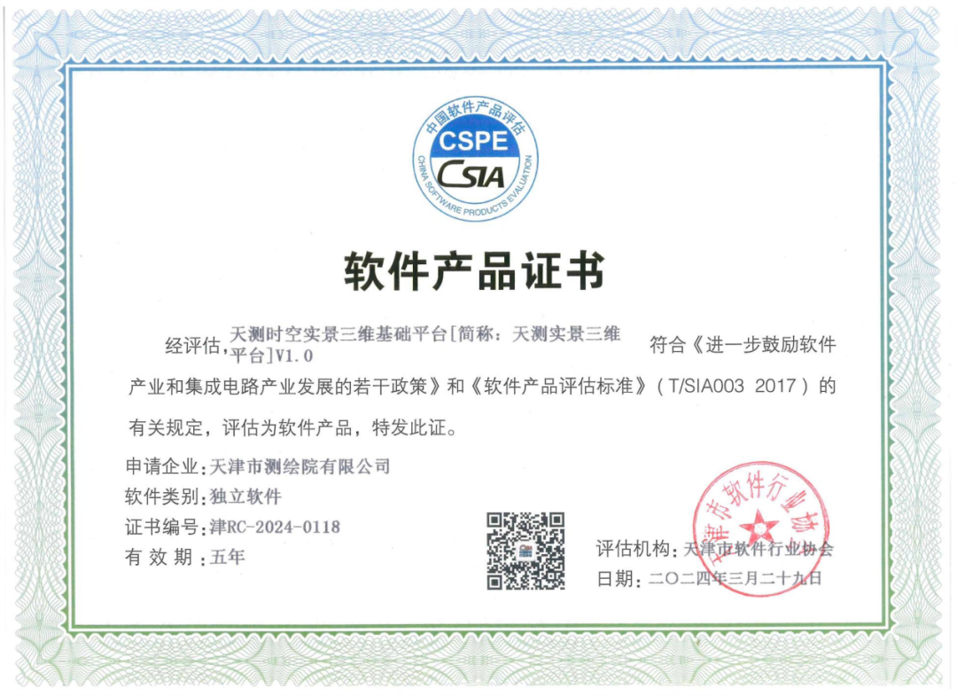 天津市測(cè)繪院有限公司自主研發(fā)的“天測(cè)時(shí)空實(shí)景三維基礎(chǔ)平臺(tái)”獲軟件產(chǎn)品證書(shū)。該證書(shū)由天津市軟件行業(yè)協(xié)會(huì)頒發(fā),標(biāo)志著天津測(cè)繪院自主研發(fā)能力獲得軟件技術(shù)領(lǐng)域權(quán)威認(rèn)可,公司數(shù)字化水平、創(chuàng)新能力及品牌影響力得到充分肯定。