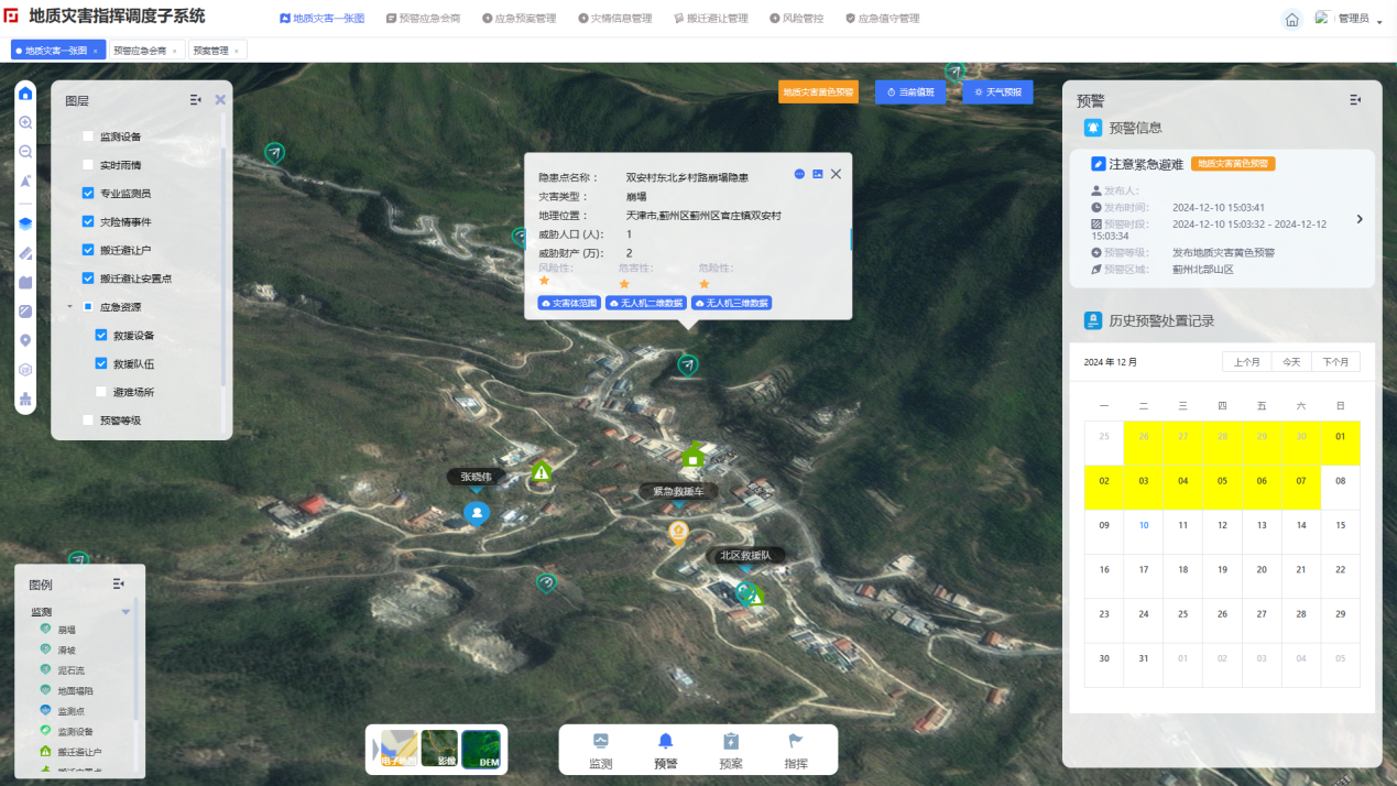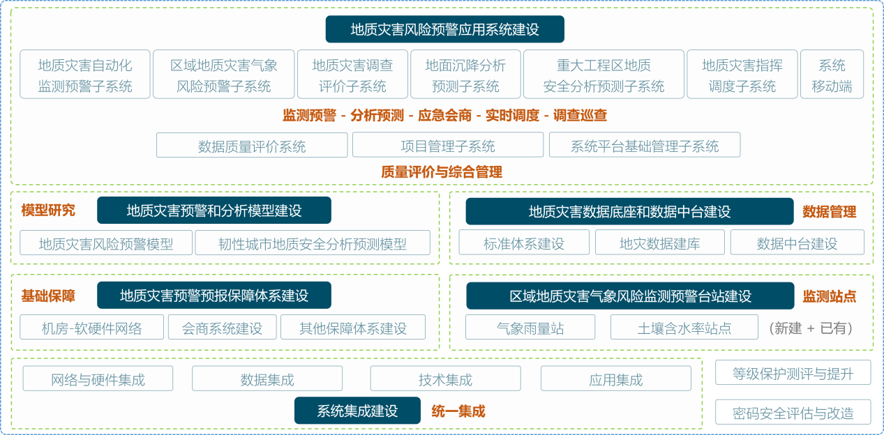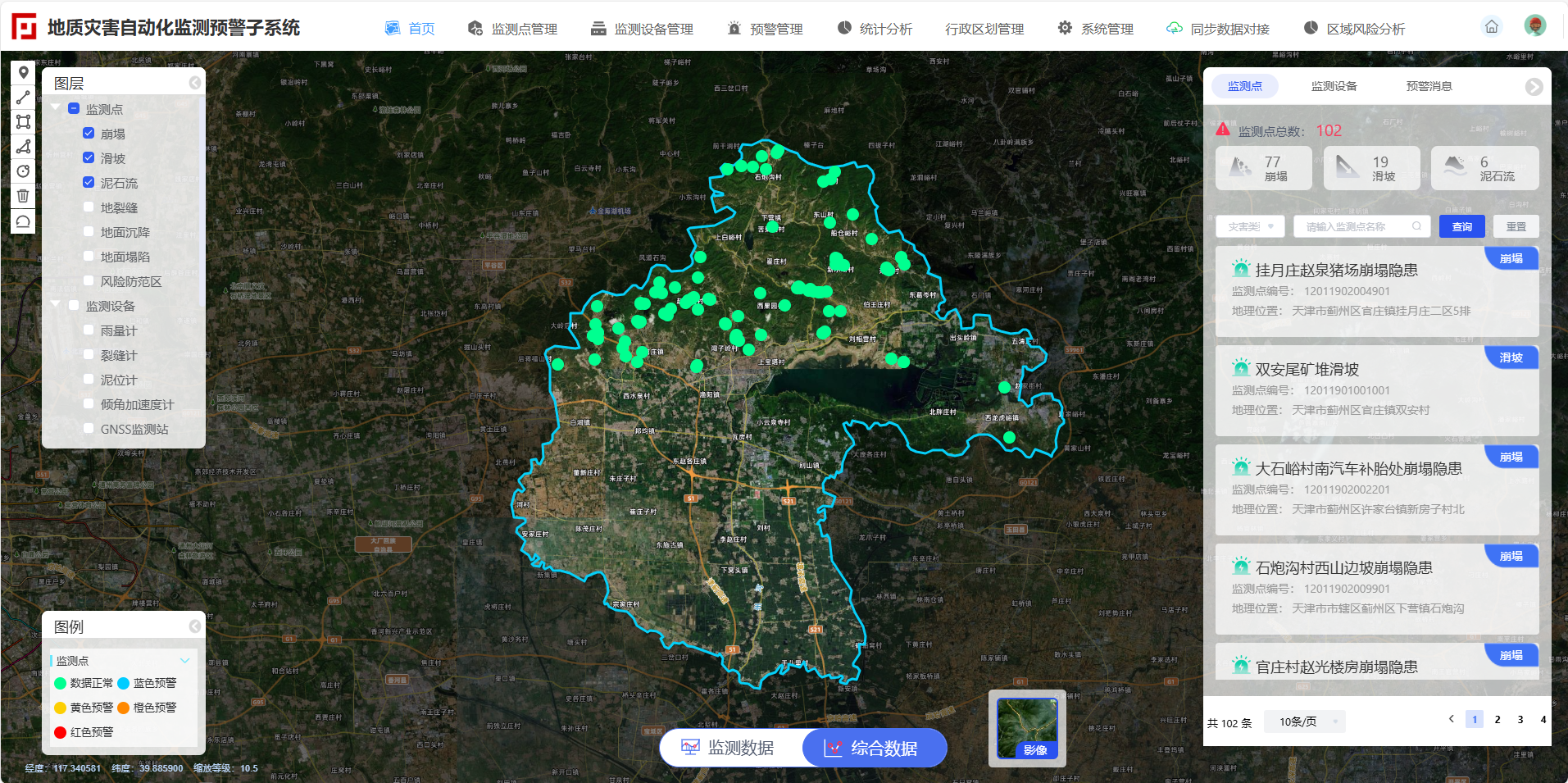 二、建設內(nèi)容 1 建設思路 圖1 建設思路 本次天津市地質災害風險預警系統(tǒng)建設項目以天津市北部山區(qū)突發(fā)性地質災害風險預警為主體,涵蓋從北部山區(qū)到平原區(qū)再到海岸帶的全部天津市范圍。項目總體建設思路如圖1所示,通過地質災害風險預警數(shù)據(jù)資源體系建設,集成預警模型和軟硬件環(huán)境,基于微服務架構實現(xiàn)系統(tǒng)一體化、數(shù)據(jù)集成化、成果可視化,實現(xiàn)基礎地質環(huán)境信息管理、地質災害自動化監(jiān)測預警、地質災害氣象風險預警、預警產(chǎn)品制作、預警成果發(fā)布、預警模型管理、預警指揮調度等基本預警業(yè)務功能,實現(xiàn)國家、市、區(qū)地質災害預警業(yè)務各層級節(jié)點互聯(lián)互通。項目建成后主要服務于自然資源部、天津市政府、天津市規(guī)劃和自然資源局及各分局、地質災害防治管理部門。 2 主要內(nèi)容 圖2 系統(tǒng)架構 本項目建設內(nèi)容如圖2所示,主要包括地質災害數(shù)據(jù)底座和數(shù)據(jù)中臺建設、地質災害預警和分析模型建設、地質災害風險預警應用系統(tǒng)建設、地質災害預警預報保障體系建設和區(qū)域地質災害氣象風險預警監(jiān)測網(wǎng)絡站點建設等。具體內(nèi)容如下: (1)建設涵蓋地理數(shù)據(jù)、遙感數(shù)據(jù)、地質災害自動化監(jiān)測數(shù)據(jù)、地質災害相關地質環(huán)境數(shù)據(jù)、氣象數(shù)據(jù)、鉆孔數(shù)據(jù)等內(nèi)容的天津市地質災害風險預警數(shù)據(jù)資源體系,形成一套完整的集數(shù)據(jù)匯集、存儲、查詢、展示、分析應用于一體的數(shù)據(jù)中臺管理系統(tǒng)。 (2)建設天津市北部山區(qū)自動化監(jiān)測預警模型、區(qū)域地質災害氣象風險預警模型,實現(xiàn)地質災害隱患點的基礎模型配置和優(yōu)化機制,實現(xiàn)精細化、智能化的區(qū)域地質災害氣象風險預警智慧中樞;進行韌性城市地質安全分析預測模型的研究,從地面沉降和重大工程地質安全兩個方面深入分析致災孕災的機理,建設支撐韌性城市地質安全的預測分析智慧中樞。 (3)從市-區(qū)兩個層面的應用需求出發(fā)建設天津市地質災害風險預警業(yè)務系統(tǒng),實現(xiàn)地質災害自動化監(jiān)測預警、區(qū)域地質災害氣象風險預警、地質災害指揮調度、地質災害調查評價、地質災害數(shù)據(jù)質量評價、韌性城市地質安全分析預測等系統(tǒng)業(yè)務功能;實現(xiàn)一個平臺不同層級系統(tǒng)使用權限的用戶管理系統(tǒng);實現(xiàn)地質災害相關項目管理系統(tǒng);實現(xiàn)系統(tǒng)移動端建設。 (4)建設支撐地質災害風險預警預測數(shù)據(jù)資源體系、地質災害數(shù)據(jù)中臺和業(yè)務系統(tǒng)、地質災害預警預測模型計算分析的軟硬件、地質災害數(shù)據(jù)中心機房環(huán)境、預警會商等保障體系和制度機制。 (5)建設包括15個氣象雨量站和8個土壤含水率站的區(qū)域地質災害氣象風險預警相關監(jiān)測站點,實現(xiàn)精細化的區(qū)域地質災害氣象風險預警業(yè)務功能。 3 典型應用場景 3.1 區(qū)域地質災害氣象風險預警 建設區(qū)域地質災害氣象風險預測子系統(tǒng),通過地質災害區(qū)域氣象風險預警數(shù)據(jù)一體化管理、預警模型配置、預警計算與成果編輯,實現(xiàn)預警成果生成和發(fā)布。預警發(fā)布支持自動臨災叫應,并可結合隱患點預警成果進行點面雙控的預警成果分析和編輯,形成最終預警產(chǎn)品,并聯(lián)合多部門進行預警會商、預警簽批等,發(fā)布最終預警成果。 圖3 區(qū)域地質災害氣象風險預測子系統(tǒng) 3.2 地質災害自動化監(jiān)測預警 建設地質災害自動化監(jiān)測預警子系統(tǒng),實現(xiàn)對設備與監(jiān)測點的一體化管理、對監(jiān)測數(shù)據(jù)全面、實時的展示與預警。同時,集成單點預警模型,結合監(jiān)測點情況自定義設置閾值,建立“一點一模型”,形成基于隱患點的監(jiān)測預警功能。系統(tǒng)實現(xiàn)了群測群防初步預警、隱患點自動化監(jiān)測預警及區(qū)域風險預警多種渠道預警方式與預警成果,支持動態(tài)更新區(qū)域風險預警,實現(xiàn)點面展示、預警處置聯(lián)動,為防災減災提供數(shù)據(jù)服務支撐。 圖4 地質災害自動化監(jiān)測預警子系統(tǒng) 3.3 地質災害應急指揮調度 建設地質災害指揮調度子系統(tǒng),融合基礎地理數(shù)據(jù)、地質災害數(shù)據(jù)、業(yè)務數(shù)據(jù)等,實現(xiàn)對地質災害相關信息的一張圖展示、災情信息管理,臨災及突發(fā)狀況時可與一線人員實現(xiàn)實時視頻通訊,可進行調度指揮、搬遷避讓、應急值守、風險管控、桌面推演、任務派發(fā)等業(yè)務的集中管理,并提供會商與災情模擬功能,輔助相關部門進行指揮決策,為突發(fā)地質災害事件會商研判、指揮調度和應急決策提供系統(tǒng)支撐,滿足汛期地質災害防御需求。 圖5 地質災害指揮調度子系統(tǒng) 3.4 地質災害風險預警時空數(shù)據(jù)管理 建設地質災害數(shù)據(jù)中臺,利用時空大數(shù)據(jù)技術,匯聚監(jiān)測、氣象、風險調查、無人機、地質等多源、多尺度、多時態(tài)數(shù)據(jù),實現(xiàn)自動化的數(shù)據(jù)接入與一體化存儲管理,結
