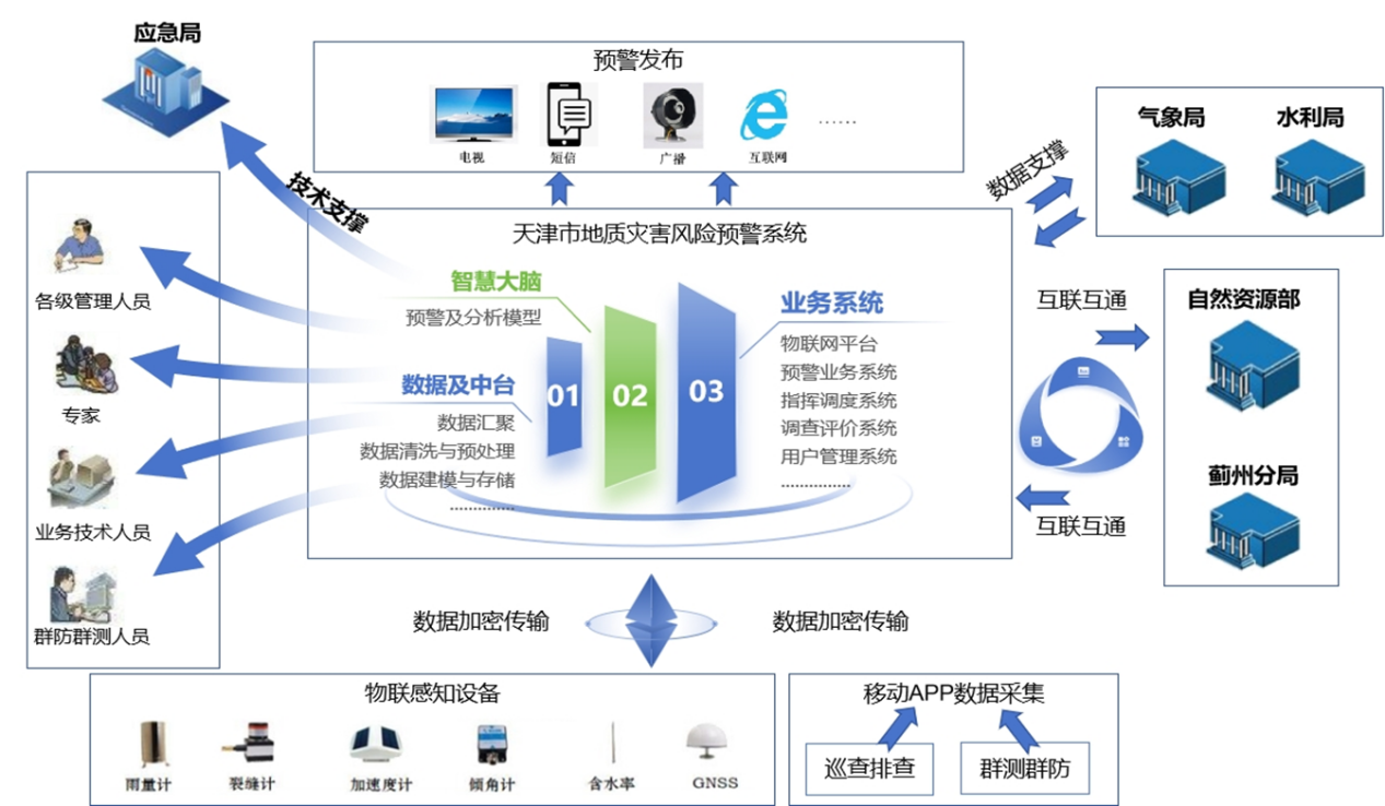 為深入貫徹落實習近平總書記關于防災工作提出的“人民至上、生命至上”“兩個堅持”“三個轉變”重要指示精神,國家相繼出臺《地質災害防治條例》、《國務院關于加強地質災害防治工作的決定》、《全國地質災害防治“十四五”規(guī)劃》等多項政策和規(guī)劃,強調要依托地質災害信息系統(tǒng),建設分布式網(wǎng)絡基礎設施,健全完善“國家-省-市-縣”四級地質災害數(shù)據(jù)庫,建設多層級、多部門互聯(lián)互通的全國地質災害信息平臺。天津市積極貫徹落實中央指示精神,制定《天津市地質災害防治規(guī)劃(2021-2025年)》,并明確提出,進一步提升地質災害風險管控能力,實現(xiàn)地質災害智慧化風險管控。
