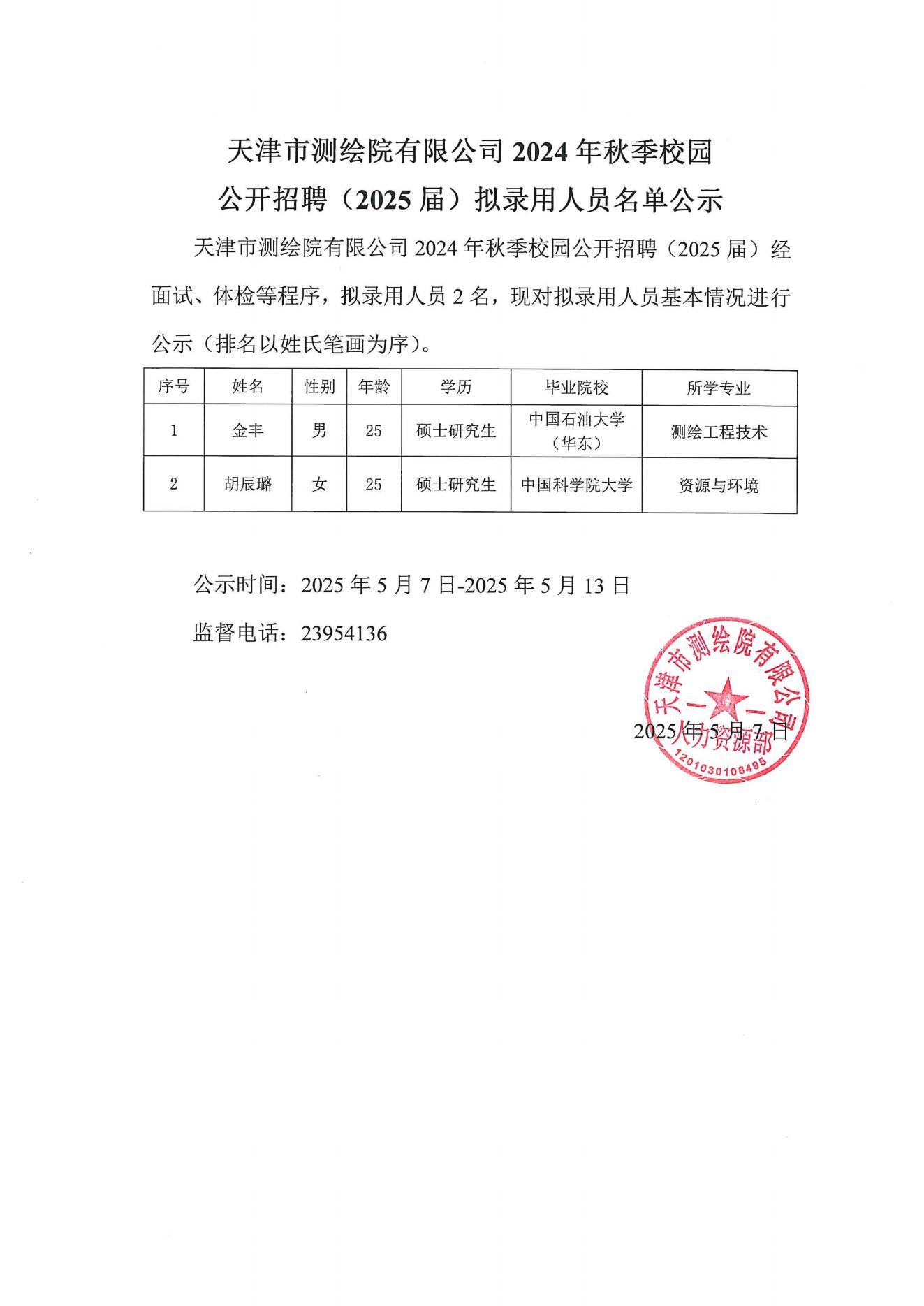 下一篇:天津市測繪院有限公司2025年春季校園公開招聘(2025屆)擬錄用人員名單公示