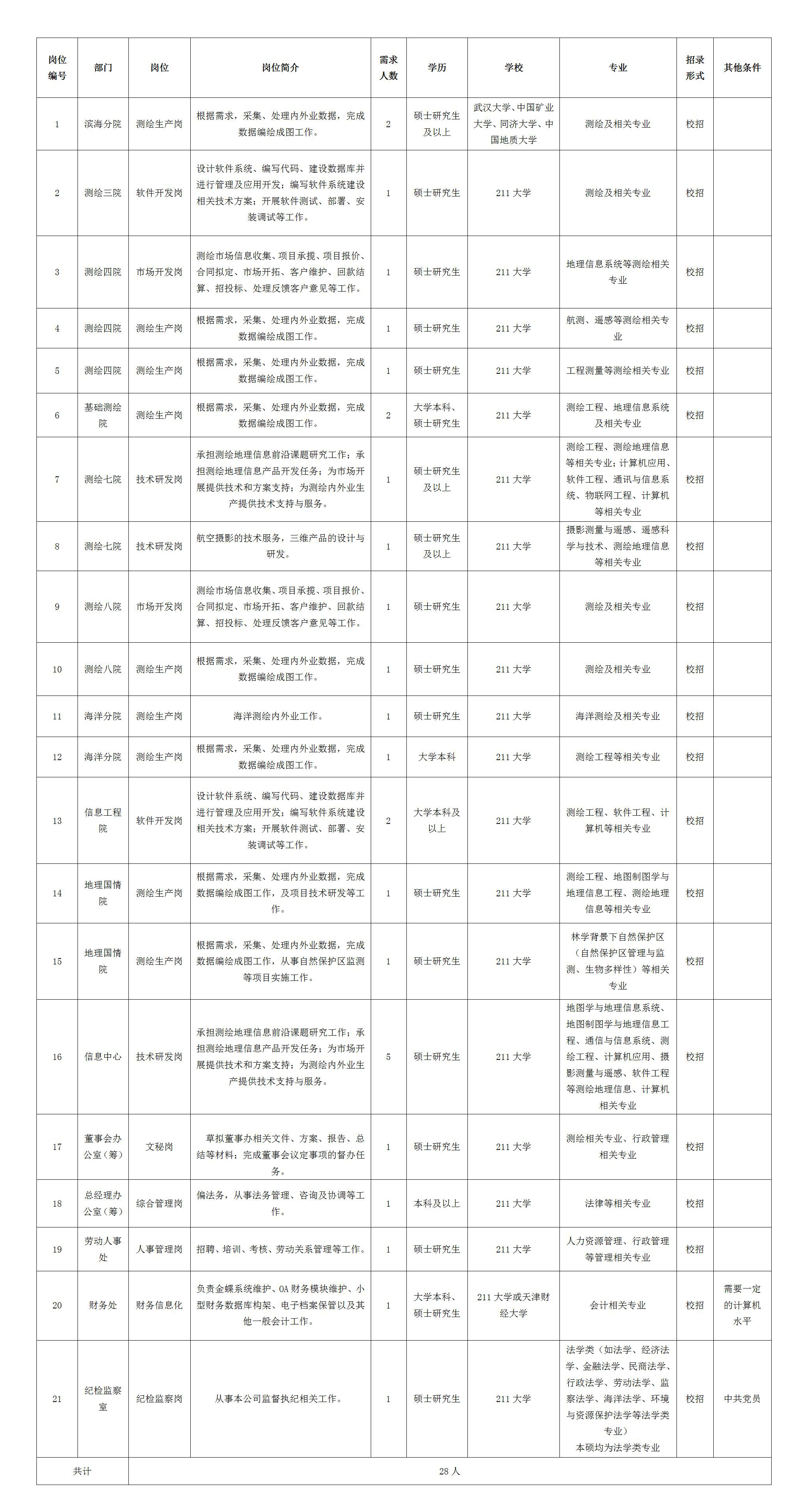 根據(jù)工作需要,天津市測繪院有限公司擬公開招聘應(yīng)屆高校畢業(yè)生28名,具體事項(xiàng)如下: